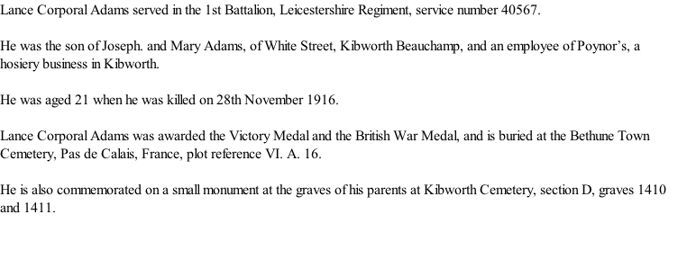 © 2005-2018, 2019  All Rights Reserved Kibworth History Society and W.G.Weston Lance Corporal Archie Adams