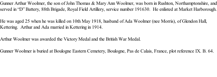 © 2005-2018, 2019  All Rights Reserved Kibworth History Society and W.G.Weston Gunner Arthur John Woolmer