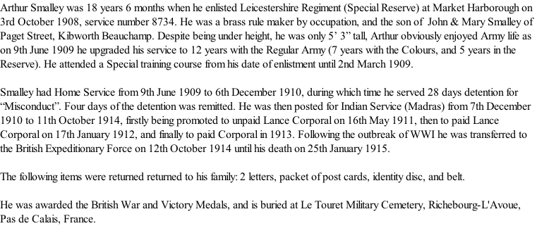 © 2005-2018, 2019  All Rights Reserved Kibworth History Society and W.G.Weston Corporal Arthur Smalley
