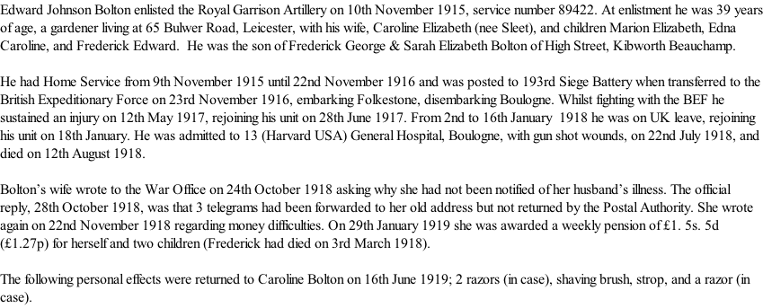 © 2005-2018, 2019  All Rights Reserved Kibworth History Society and W.G.Weston Gunner Edward Johnson Bolton Gunner Bolton  was awarded the British War and Victory Medals, and is buried at Terlincthum British Cemetery, Boulogne, Pas de Calais, France, plot II. B. 44. Cap badge of the Royal Garrison Artillery