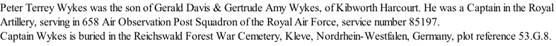 Such a one was Captain Peter Terrey Wykes, who while flying in support of the troops crossing the Rhine was shot down, and met his death at the age of 24, on March 24th, 1945.