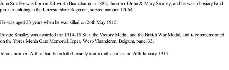 Mrs. John Smalley of Dover Street, Kibworth, has been officially notified that her husband, Private John Smalley of the 2nd Leicesters, has been killed in action. The deceased was an employee of Messrs. Johnson and Barnes, and rose by close study and by natural tact to be a skilled mechanic. He was in the Boer War. He is the second son of Mrs. John Smalley, of Paget Street, to fall in the war.