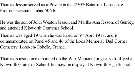 © 2005-2018, 2019  All Rights Reserved Kibworth History Society and W.G.Weston Private Thomas Charles Jesson