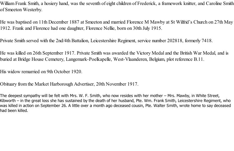 © 2005-2018, 2019  All Rights Reserved Kibworth History Society and W.G.Weston Private William Frank Smith