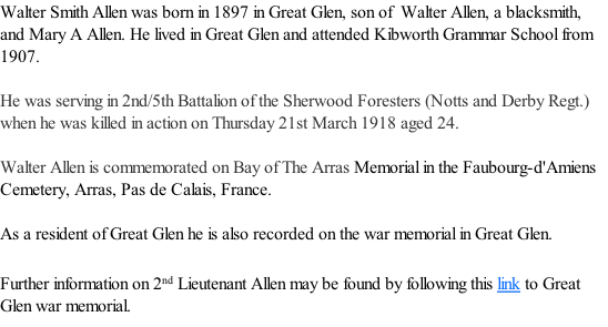 © 2005-2018, 2019  All Rights Reserved Kibworth History Society and W.G.Weston 2nd Lieutenant Walter Smith Allen